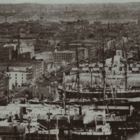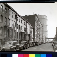 This Berenice Abbott photo shows the hulking gas tanks that stored the gas from the New York Gas Works (The buildings in the foreground of the photo were built after the Famine immigrants arrived.).