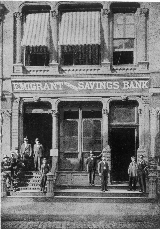 Photo of the exterior of the Emigrant Savings Bank's original location at 51 Chambers Street behind City Hall. The bank dates this photo (which the photographer touched up by hand) to 1858.