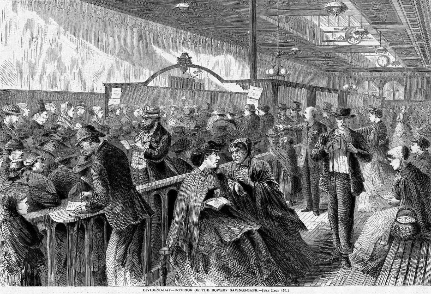 Published in Harpers Weekly (July 23, 1870), this depicts the interior of the Bowery Savings Bank.