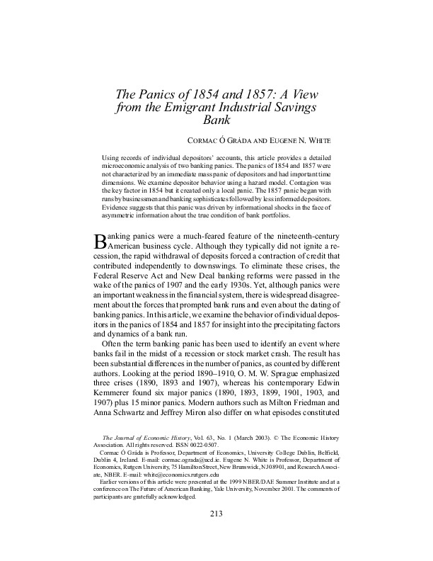 “The Panics of 1854 and 1857: A View from the Emigrant Industrial Savings Bank”
