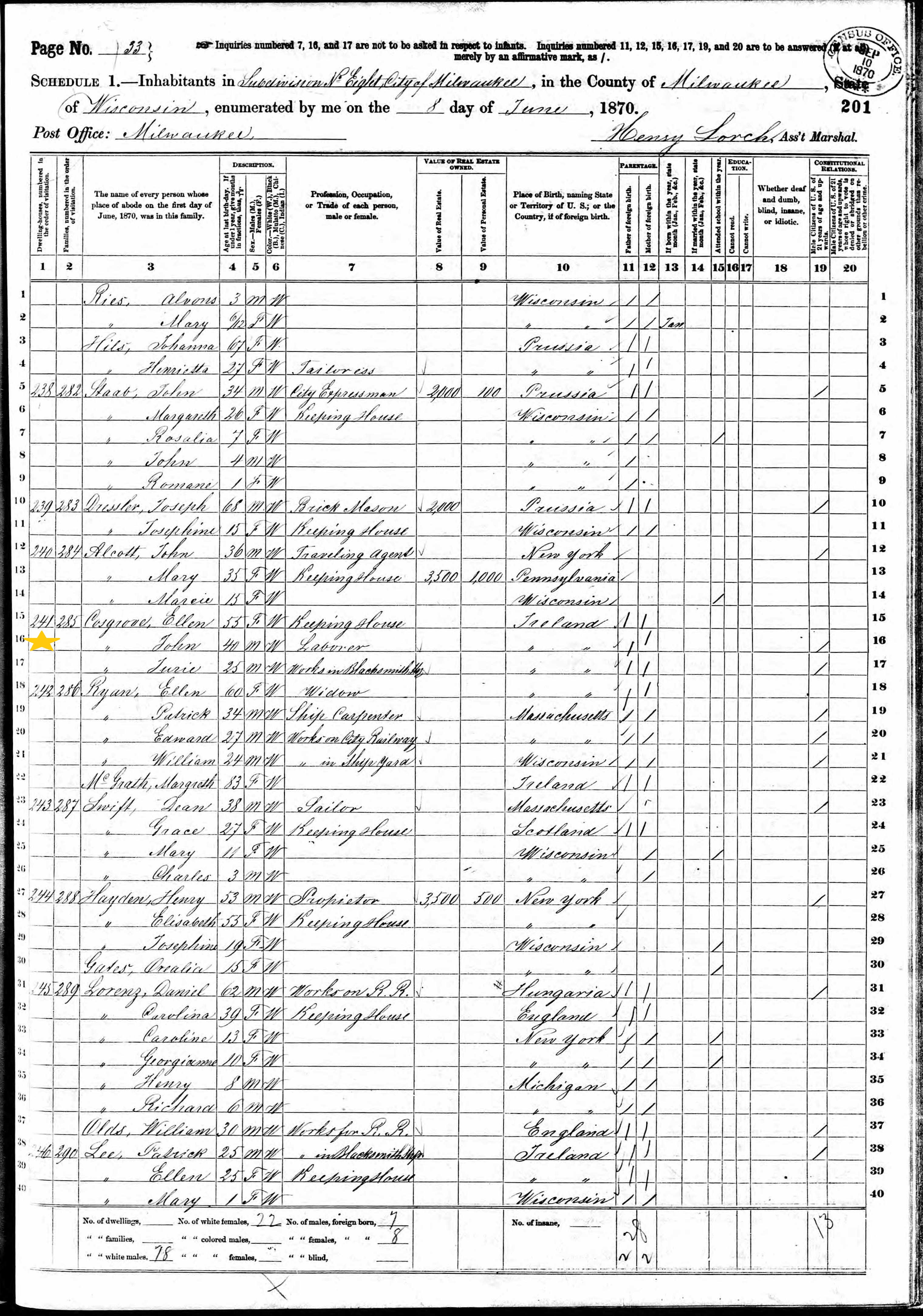 John Cosgrove; 1870 Census