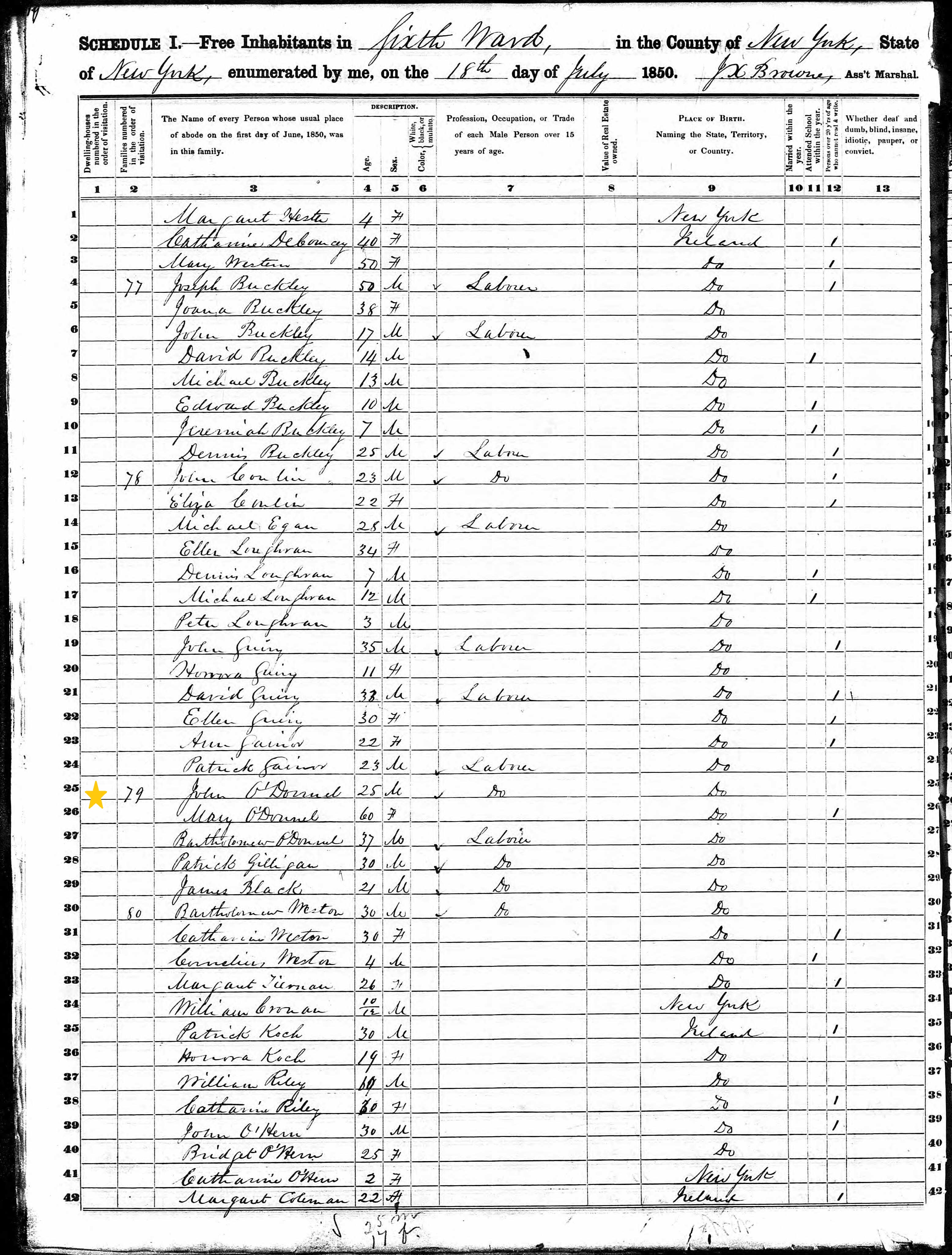 Bartholomew O'Donnell; 1850 Census