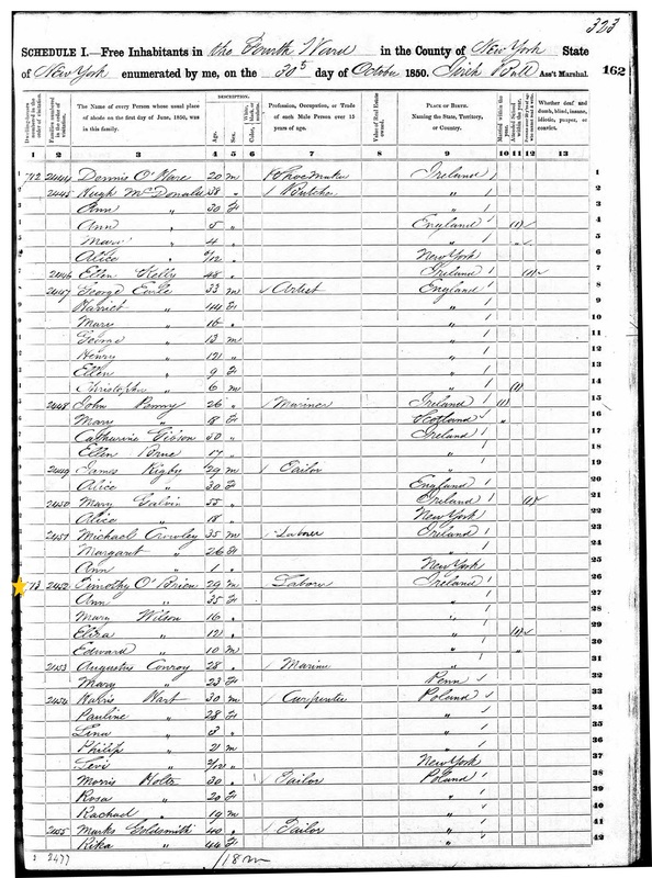 O'Brien and his wife, Ann, and children are listed. Timothy is identified as a 29 year old laborer.