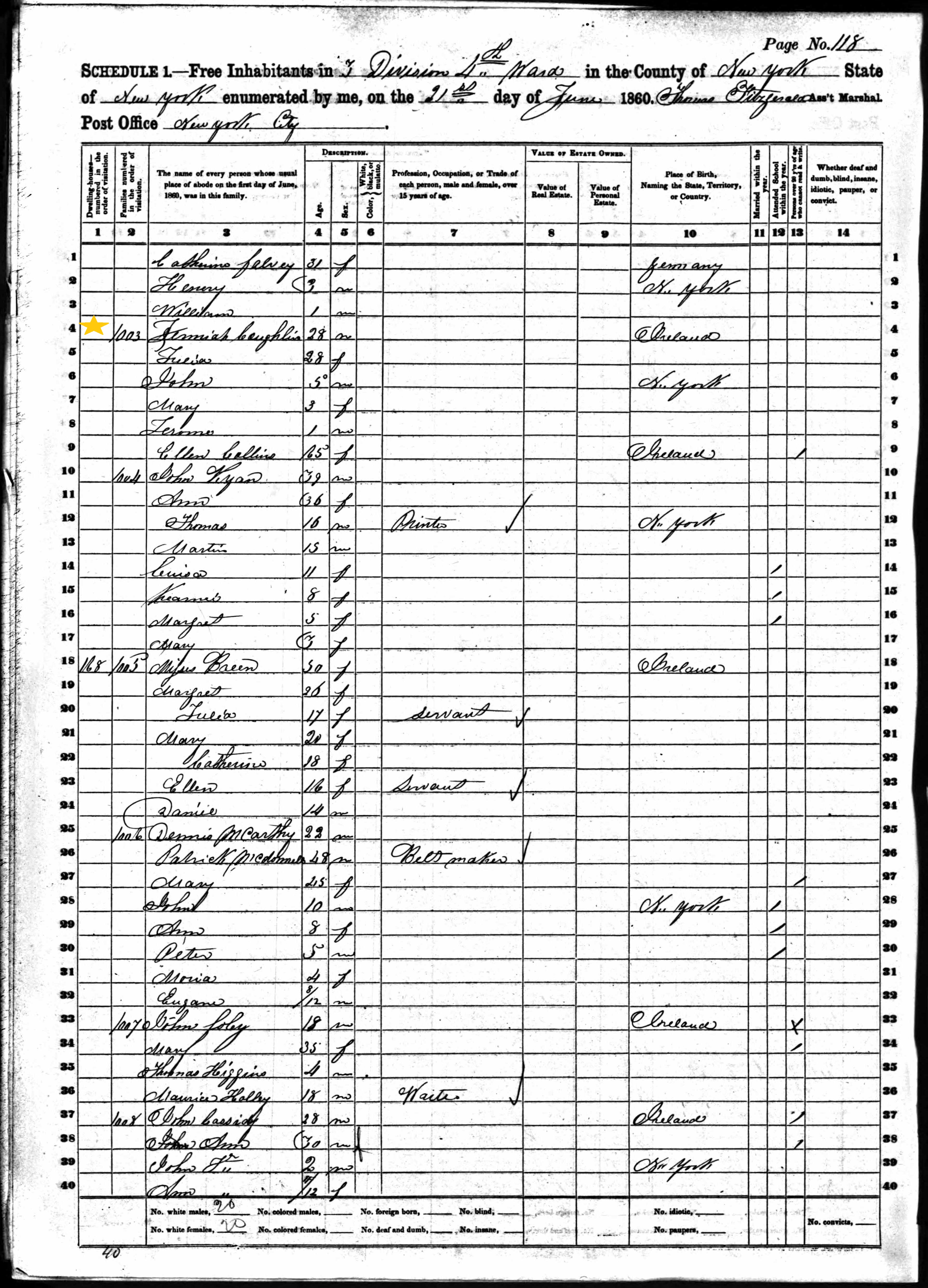 Jeremiah Coughlin; 1860 Census