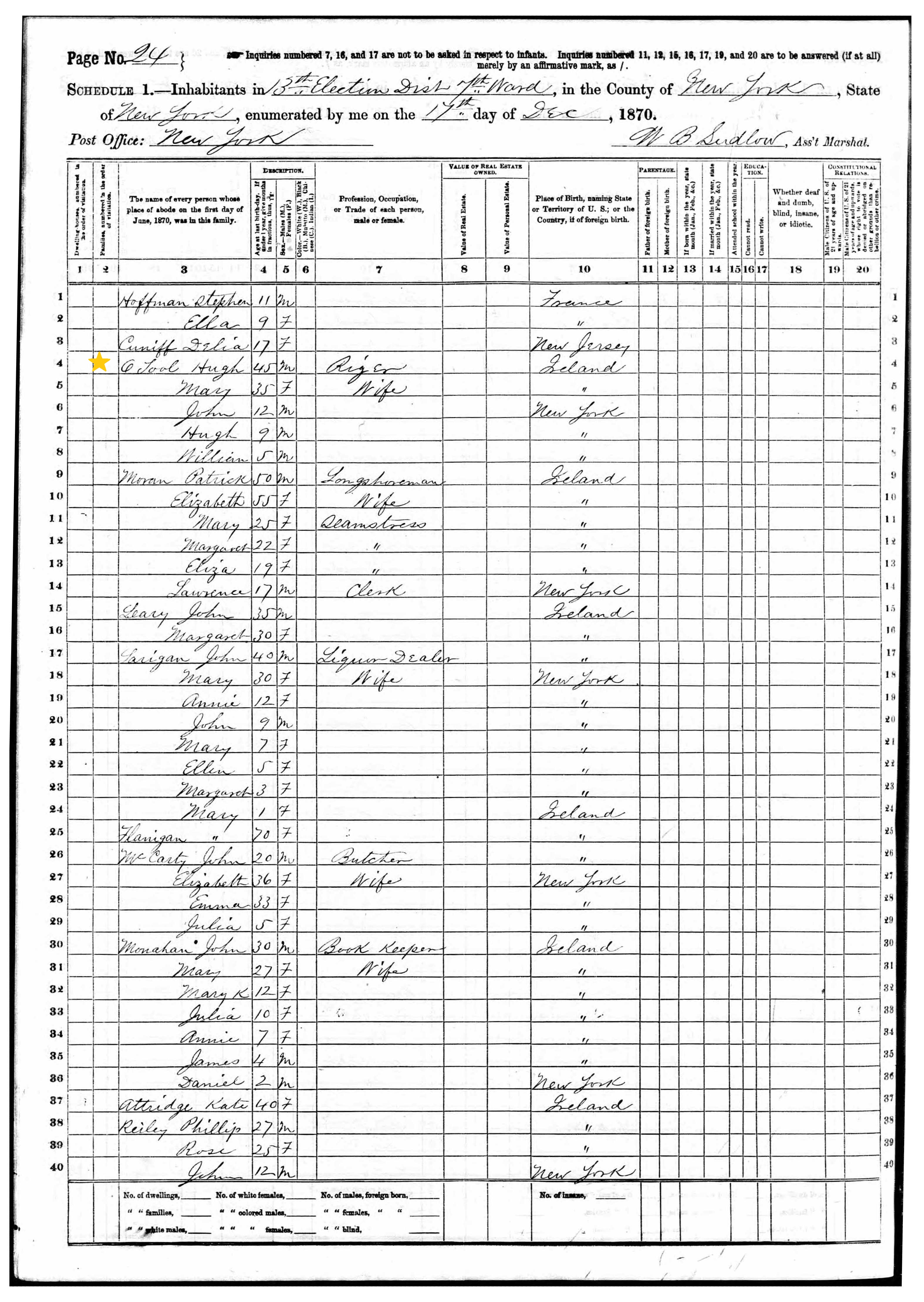 Hugh O'Toole; 1870 Census