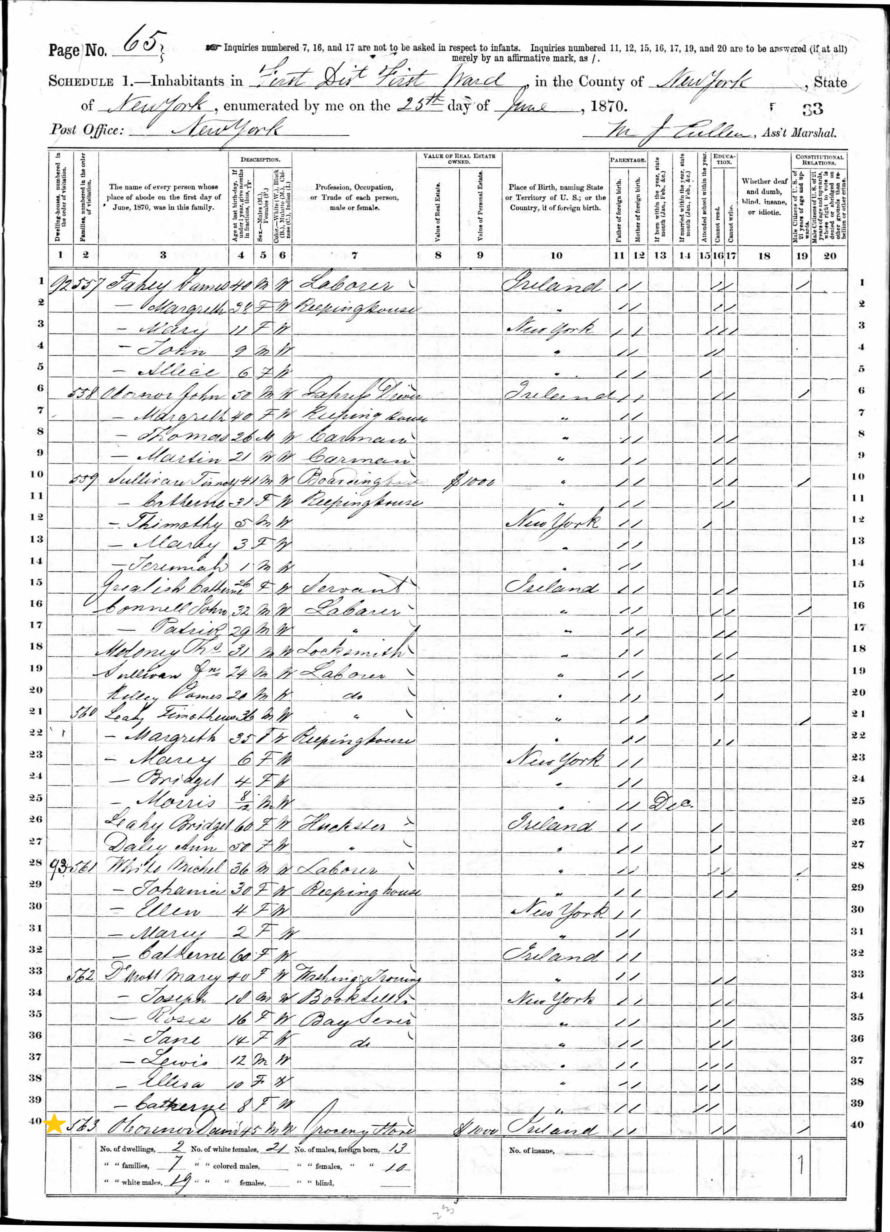 David O'Connor; 1870 Census (1)
