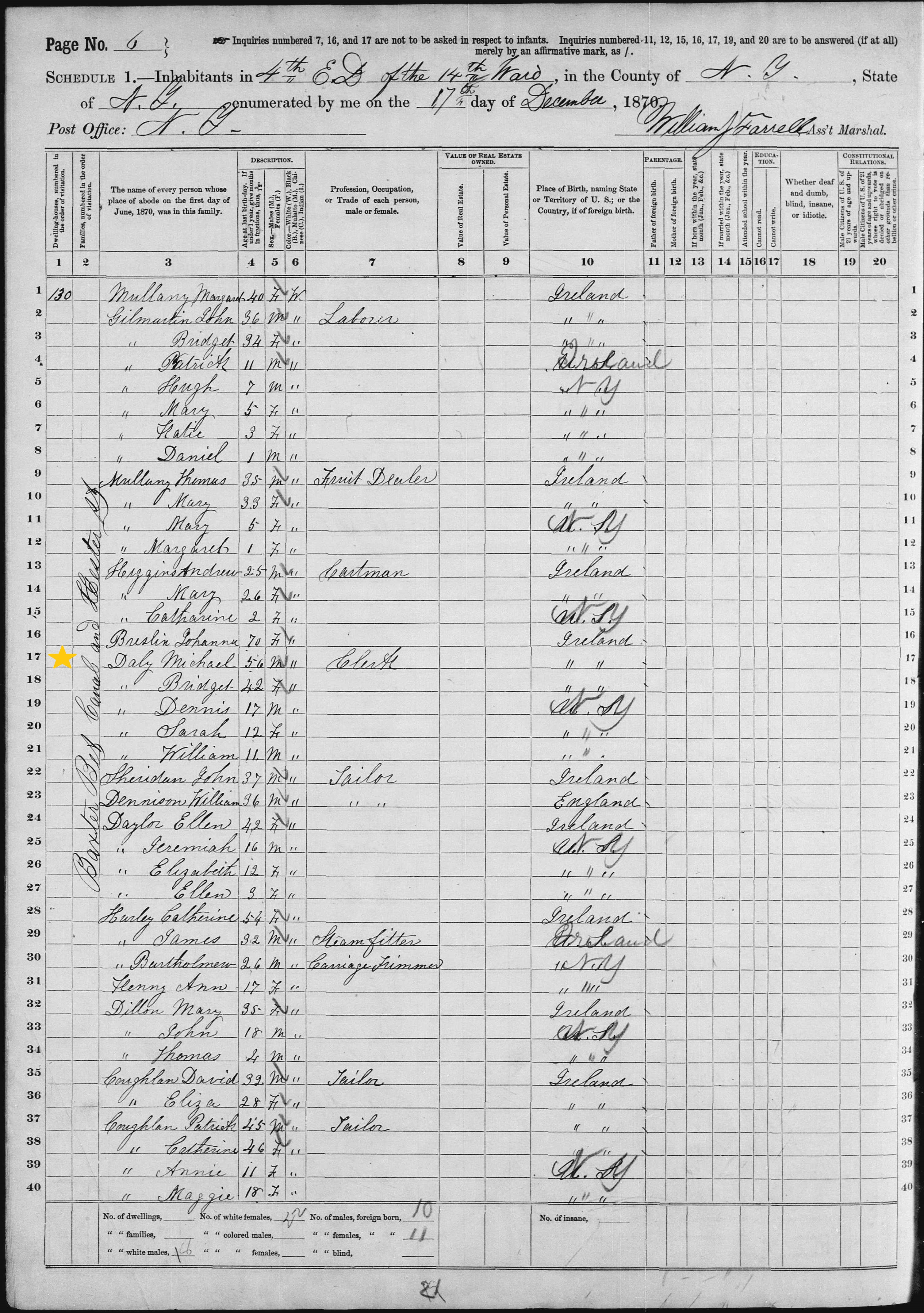 Michael Daly; 1870 Census