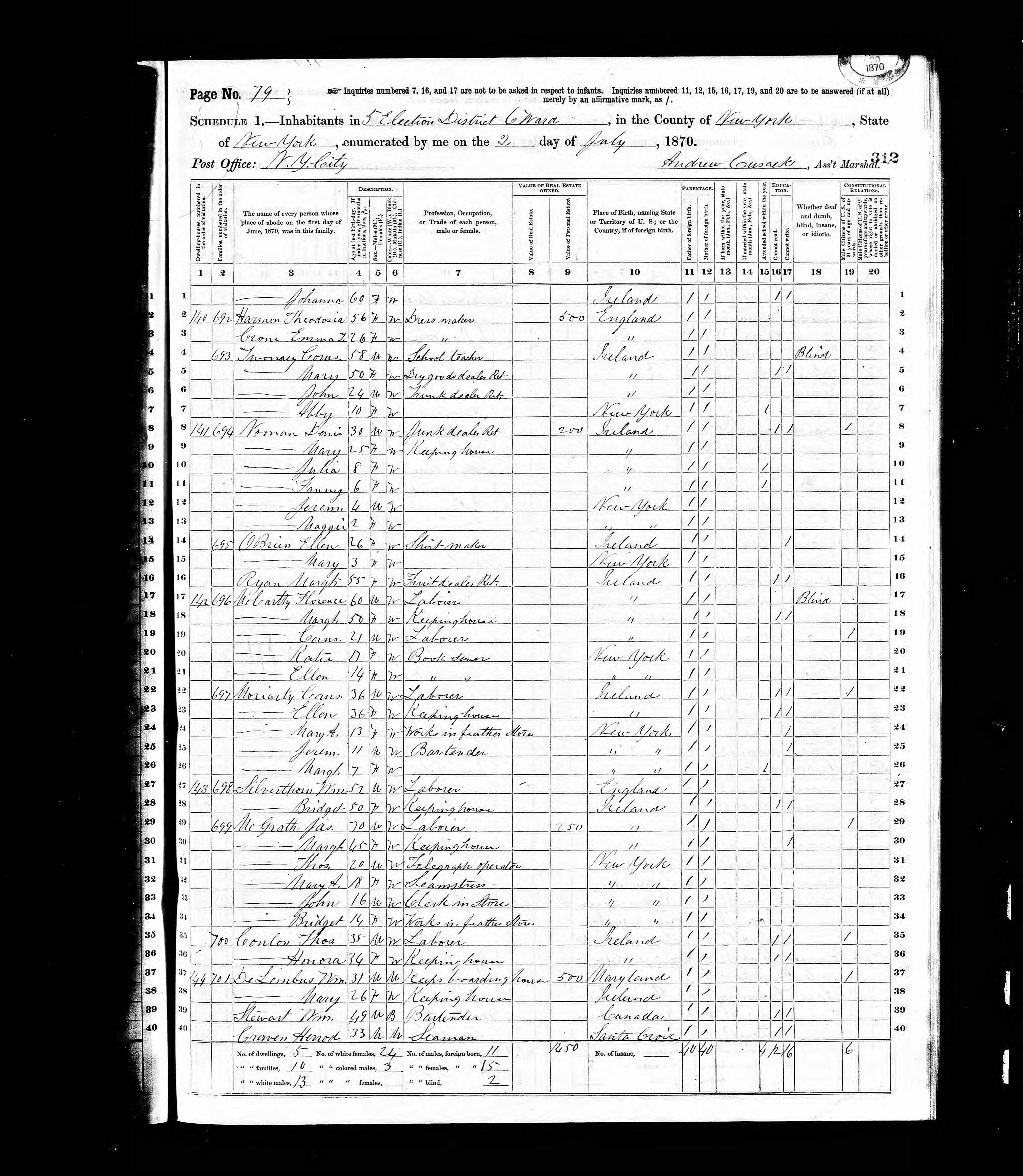 Cornelius Twomey; 1870 Census