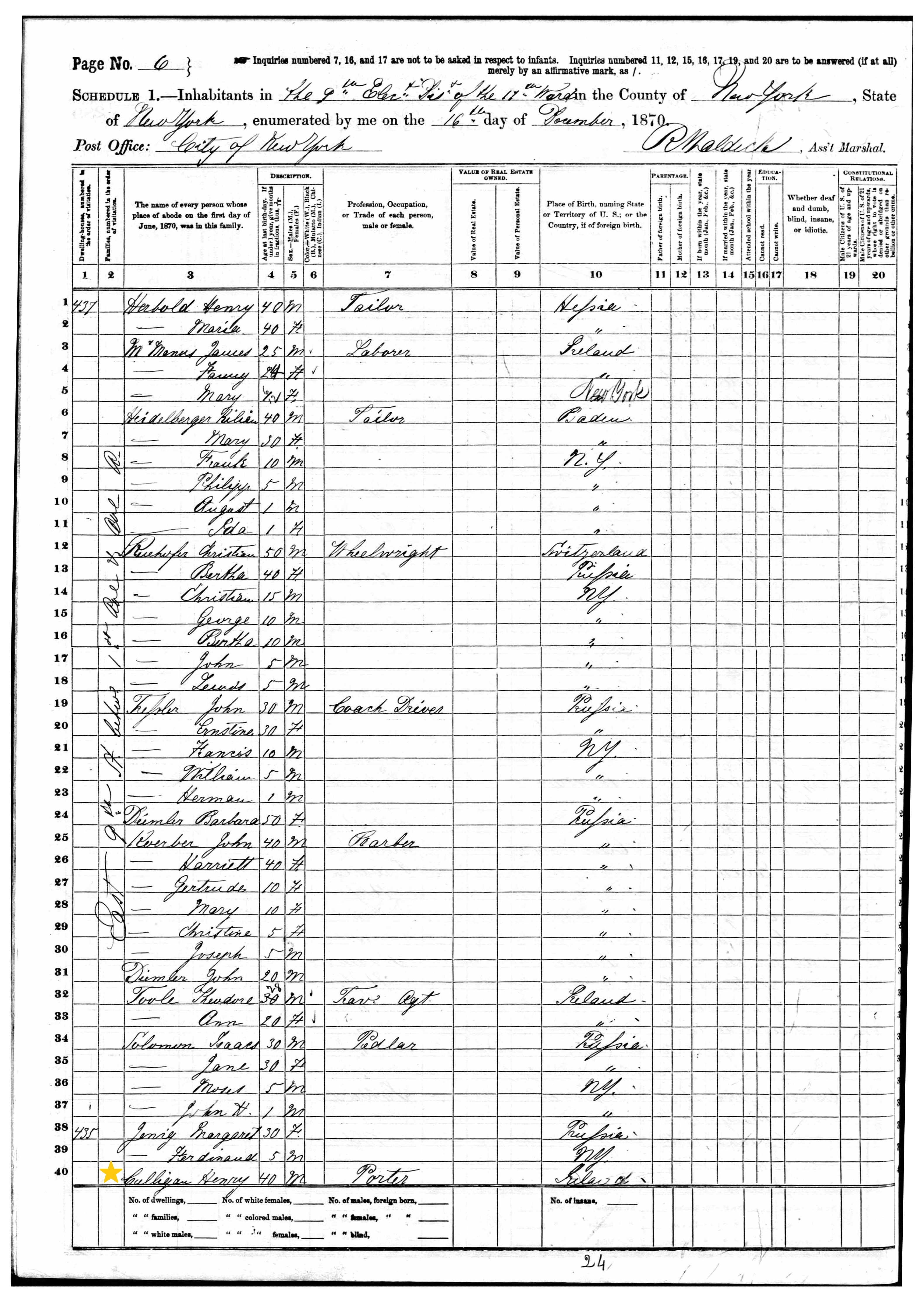 Henry Colligan; 1870 Census (1)