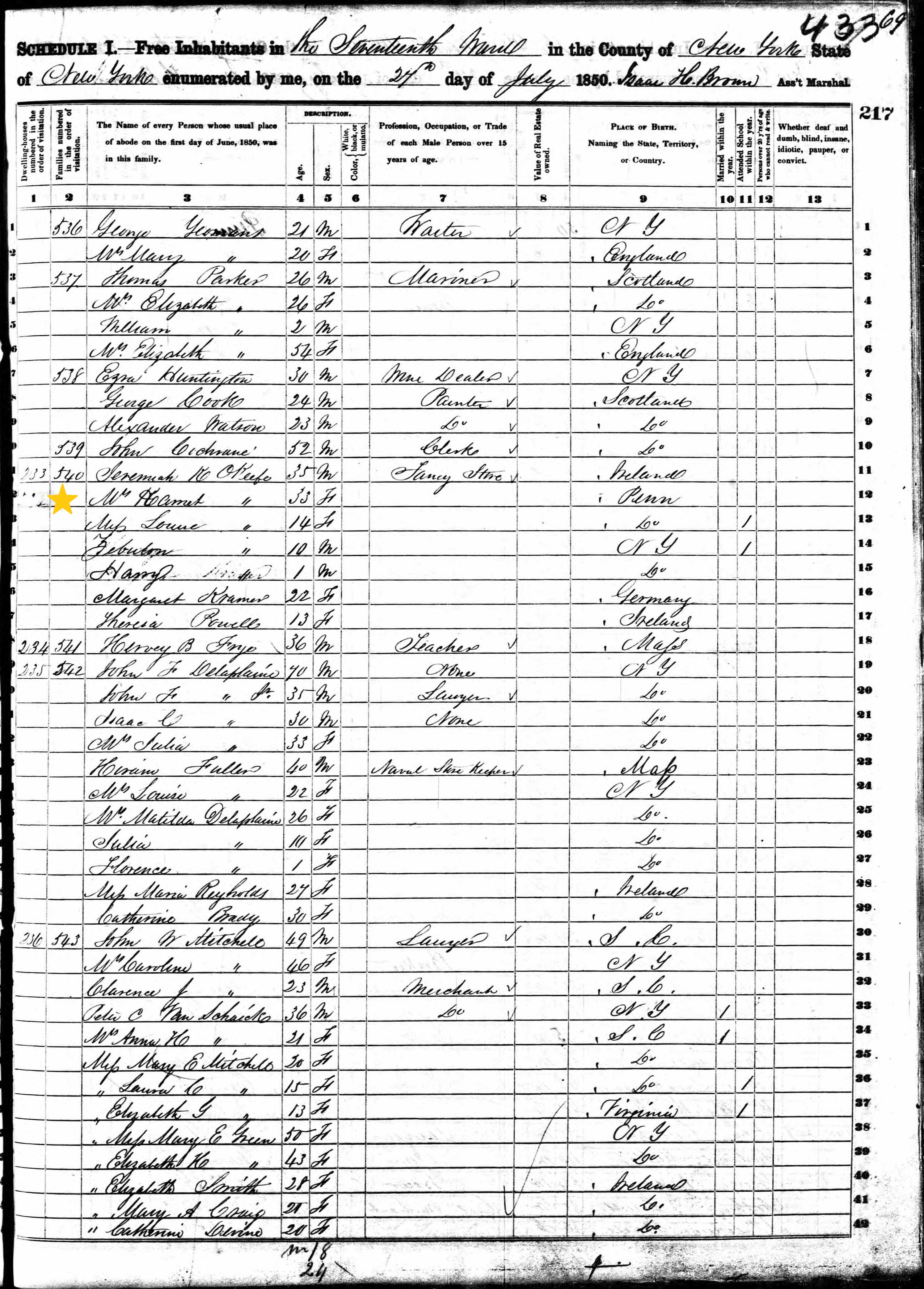 Jeremiah K. O'Keeffe; 1850 Census