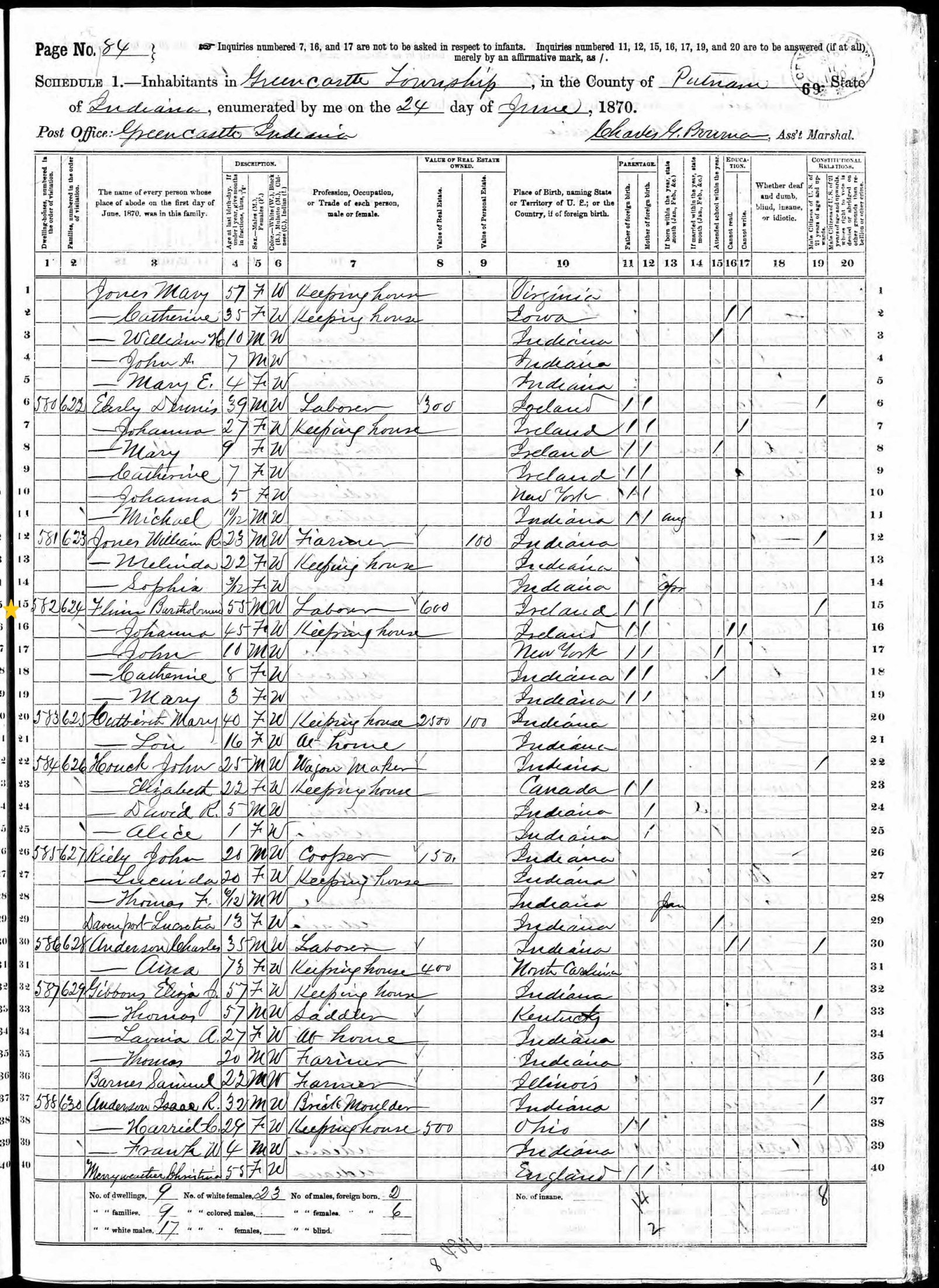 Bartholomew Finn; 1870 Census
