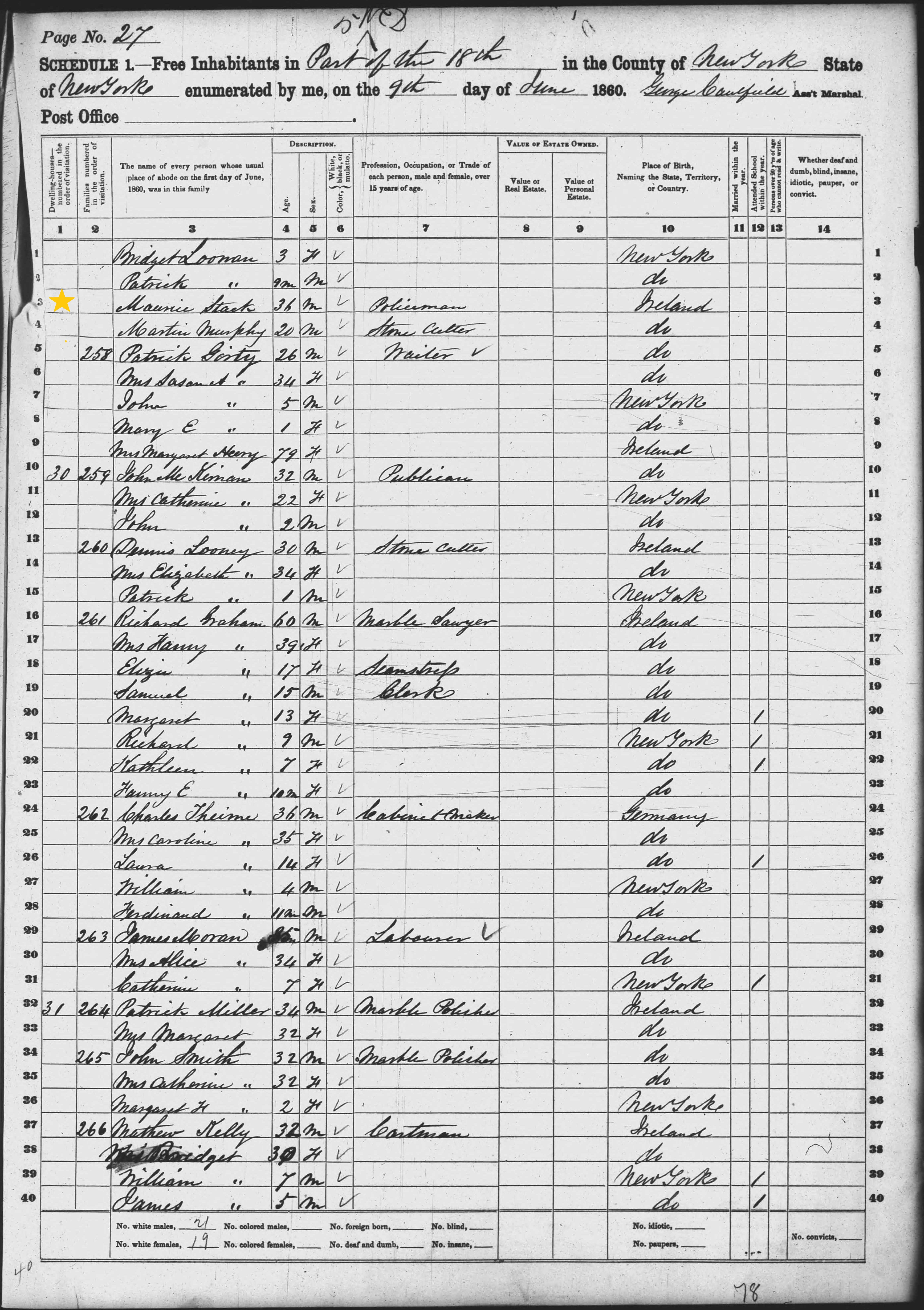 second page of 1860 census identifying Maurice Stack
