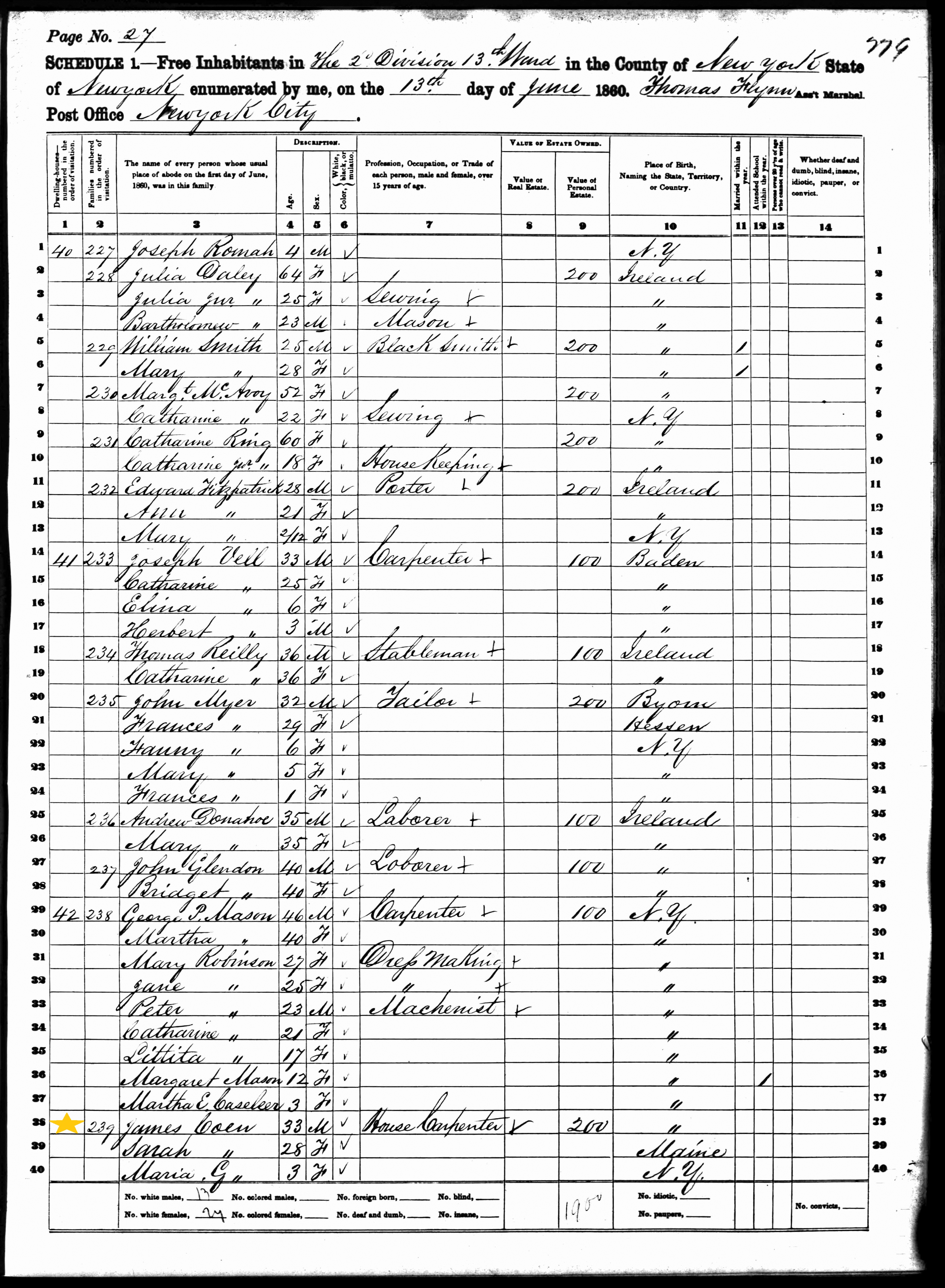 James Coen; 1860 Census