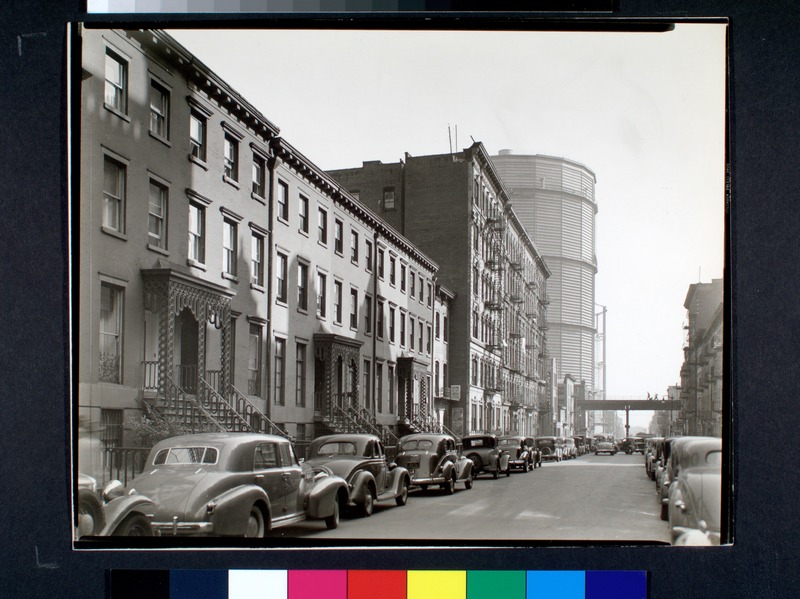 This Berenice Abbott photo shows the hulking gas tanks that stored the gas from the New York Gas Works (The buildings in the foreground of the photo were built after the Famine immigrants arrived.).