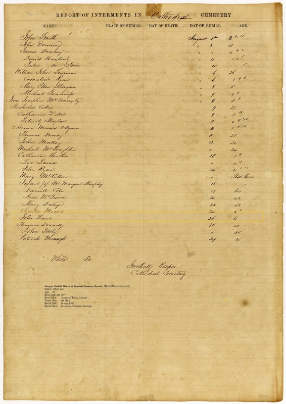 Savannah Cathedral cemetery record showing Mary's husband John laid to rest