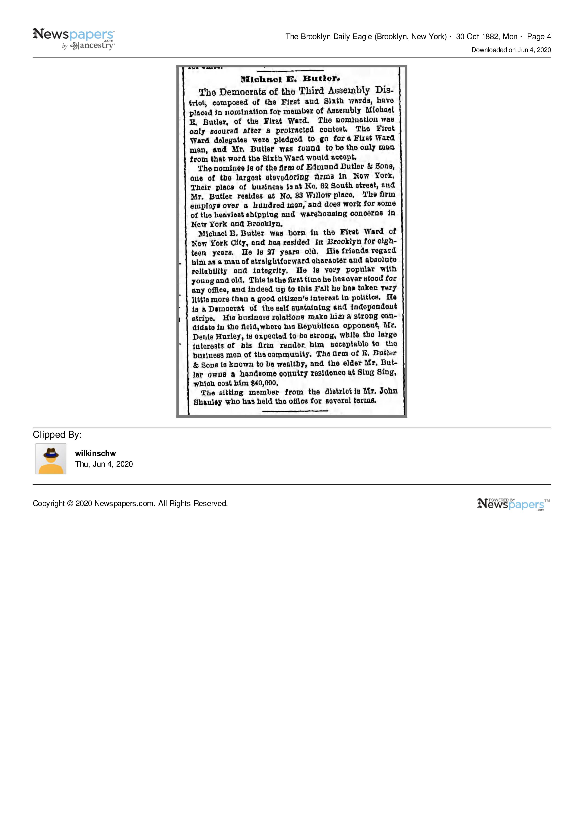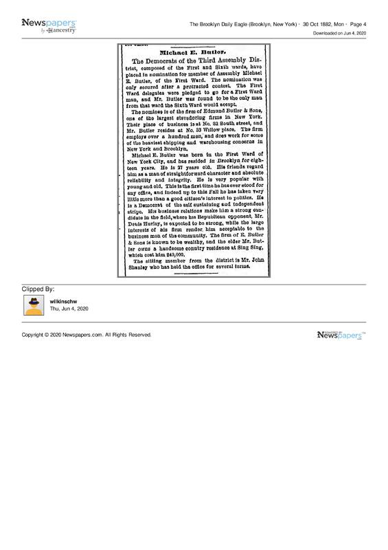 Article from The Brooklyn Daily Eagle about Michael Butler, 1882, mentions his father, Edmund Butler