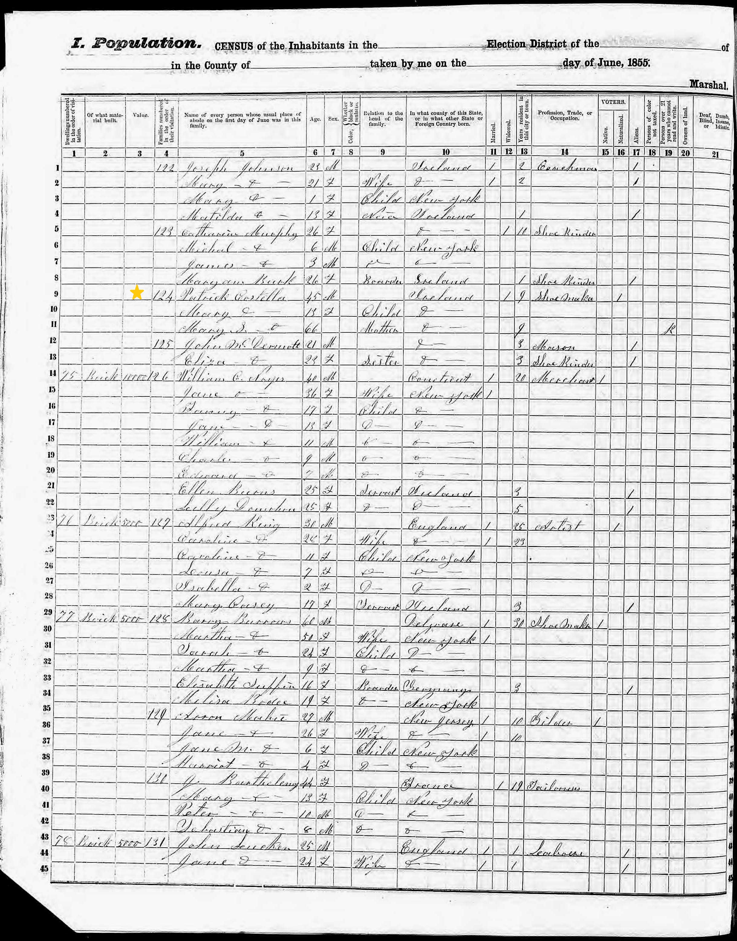 Patrick J. Costello; 1855 Census