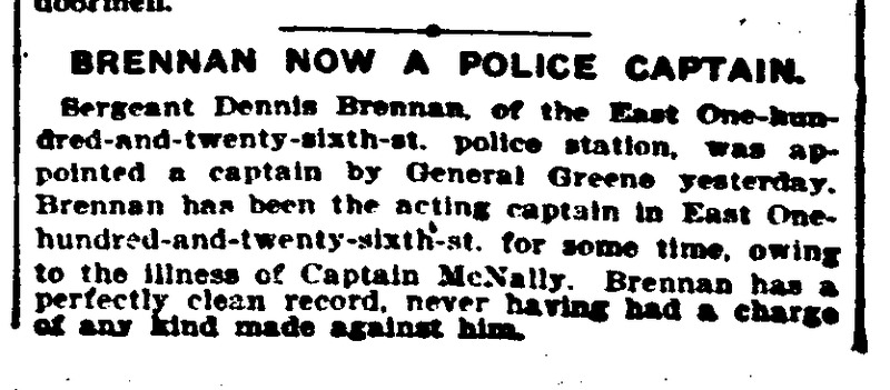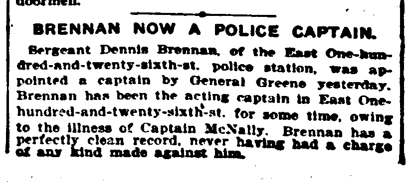 Denis Brennan, of the East 126 Street Police Station, appointed captain. Article in New York Tribune. Name spelled "Dennis."
