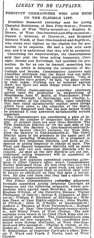 Denis Brennan mentioned in New York Tribune (1896) as likely to be named police captain. Name spelled "Dennis."