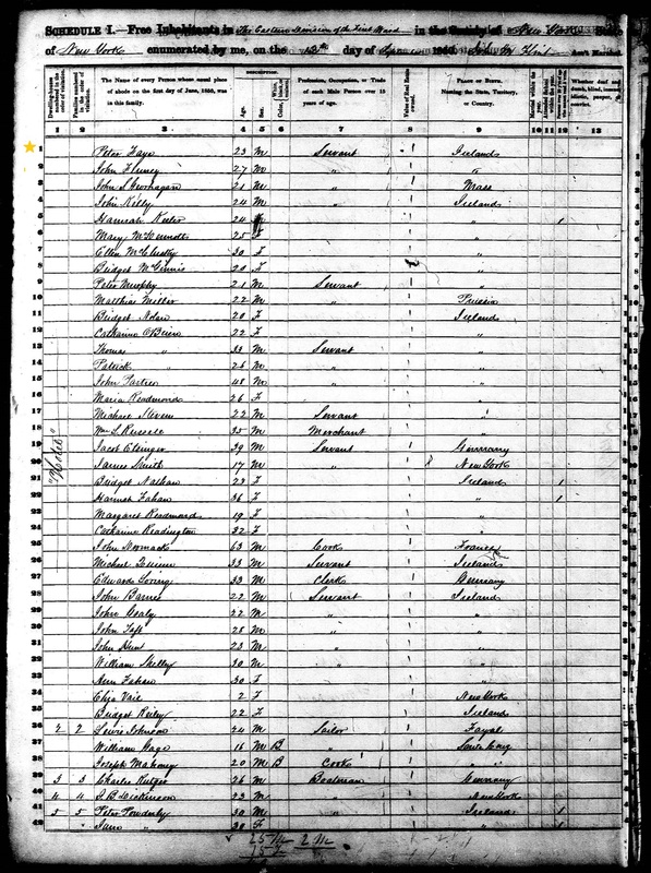 A page from the 1850 census showing Peter J. Faye's name and occupation. His occupation, here, is listed as "servant."