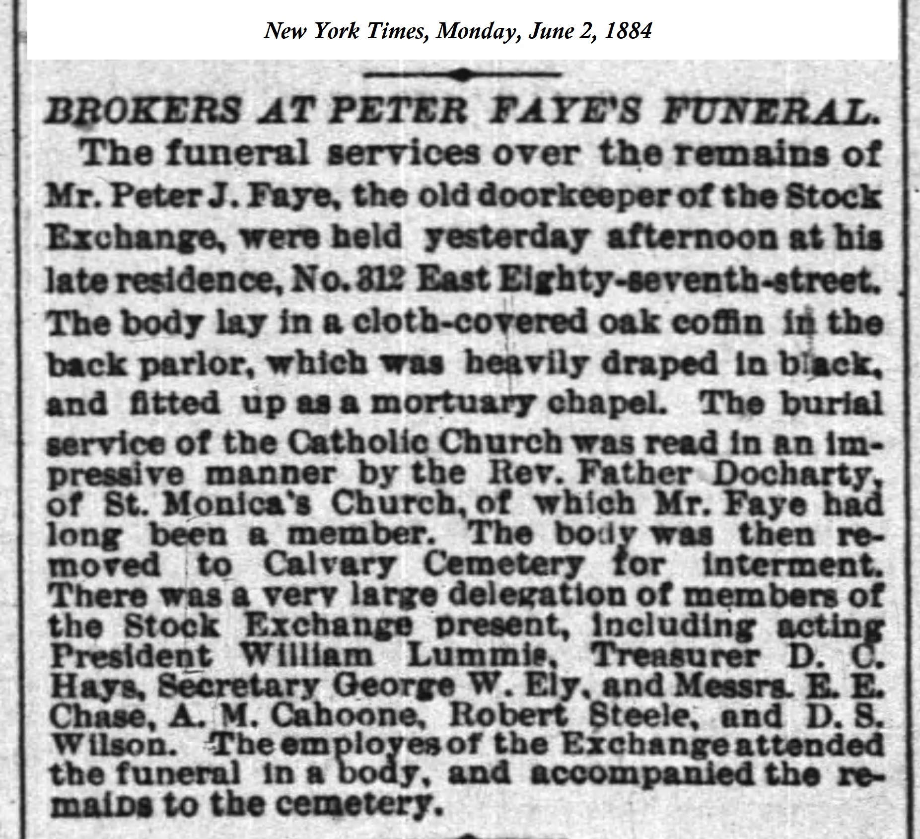 This notice appeared in the New York Times on Monday, June 2, 1884; it describes both the life and funeral of Peter J Faye.