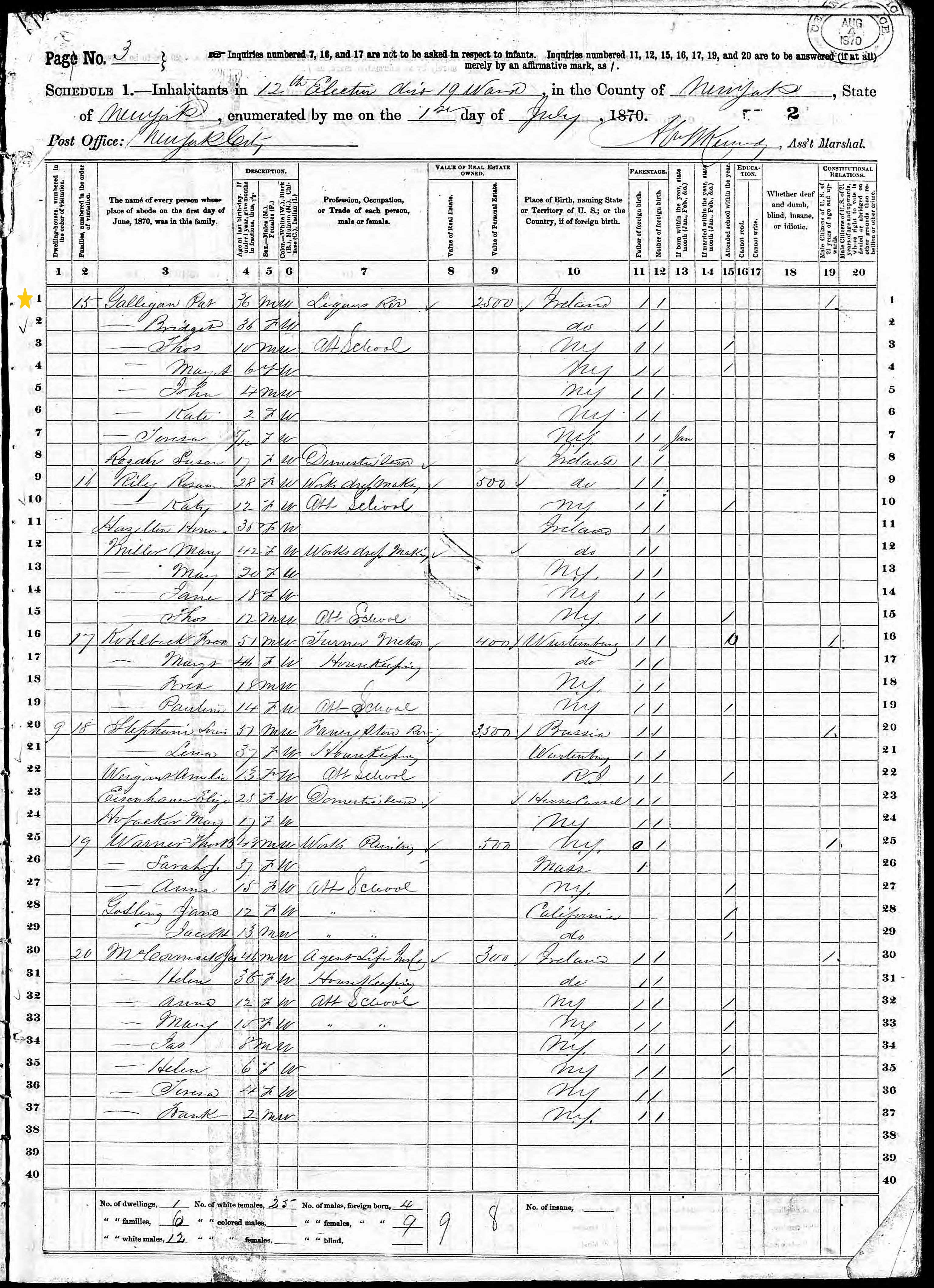 Bernard Galligan; 1870 Census