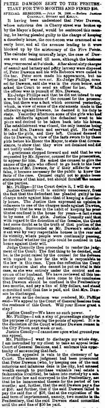 New York Daily Tribune update on the case against Peter Dawson. See column 6. Dawson was sent to prison for two months and fined $50 for keeping a "disorderly house."