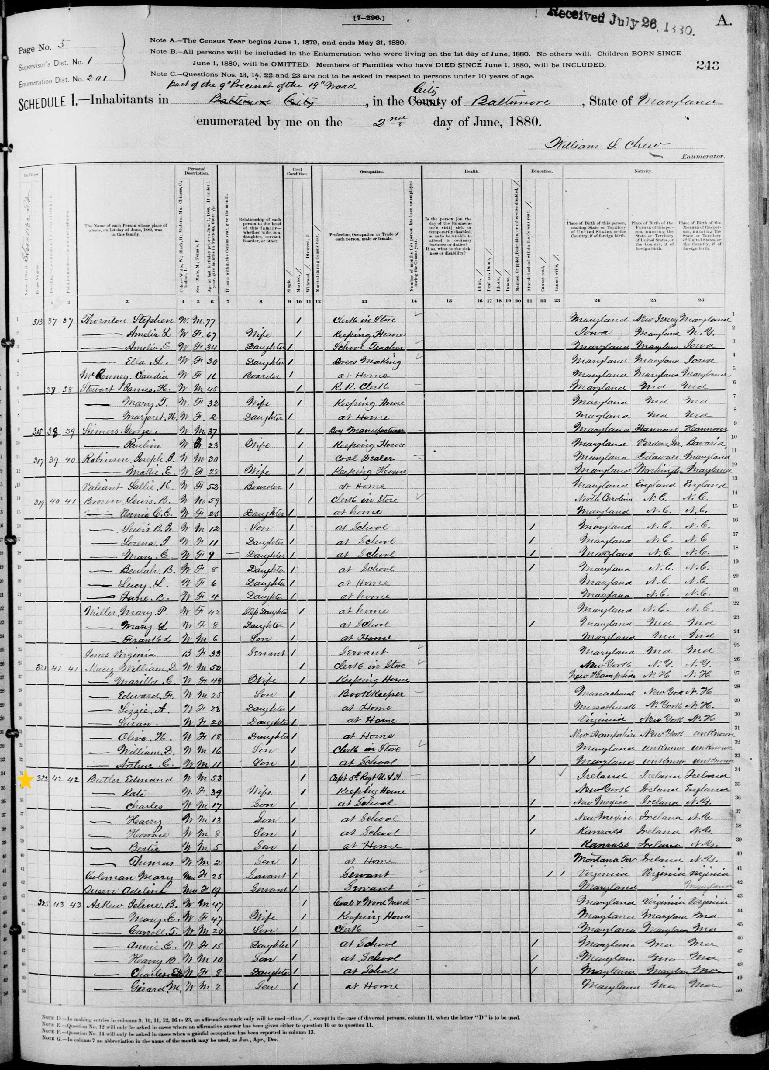1880 Census for Baltimore, Maryland showing Edmond Butler
