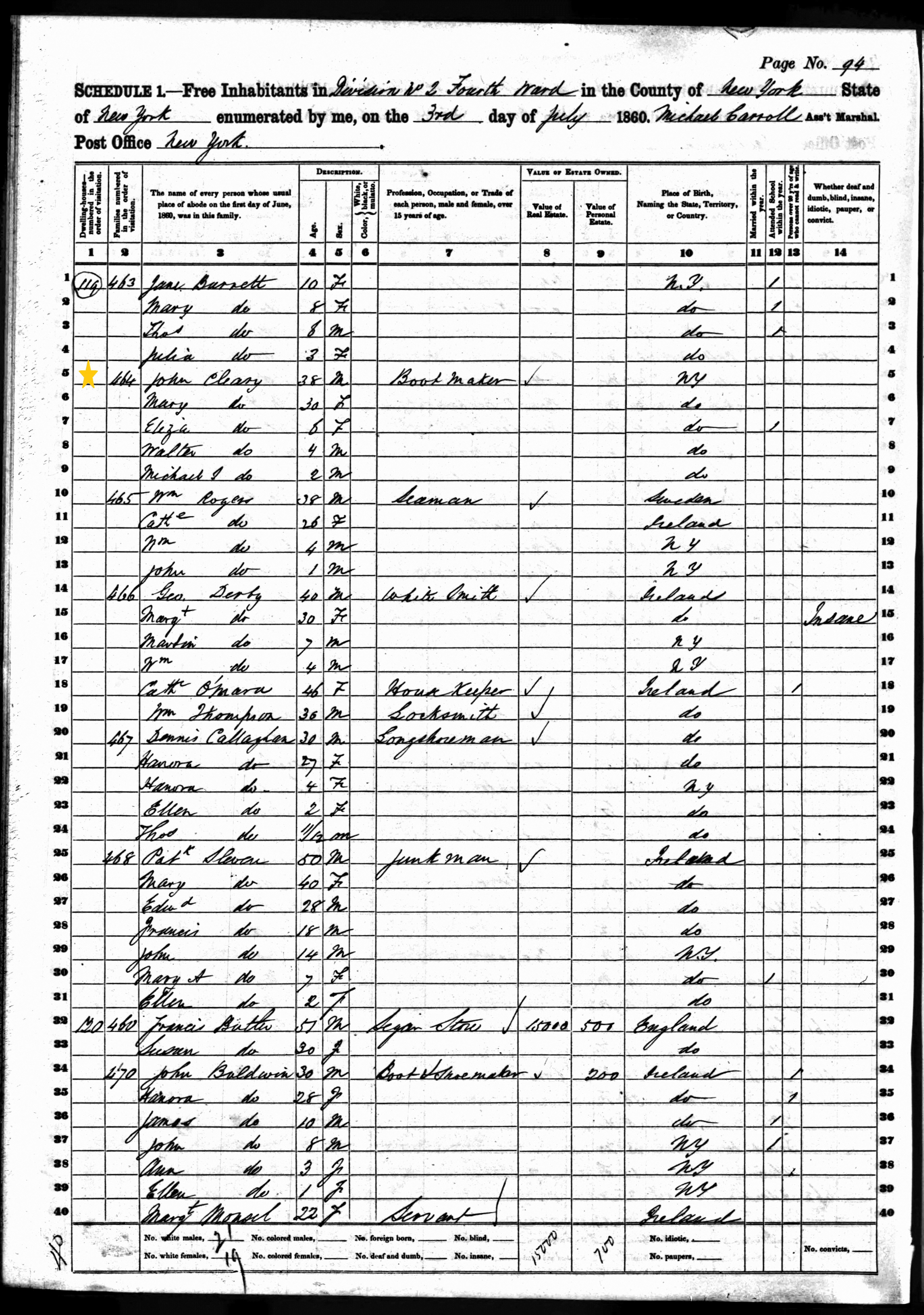 John Cleary; 1860 Census