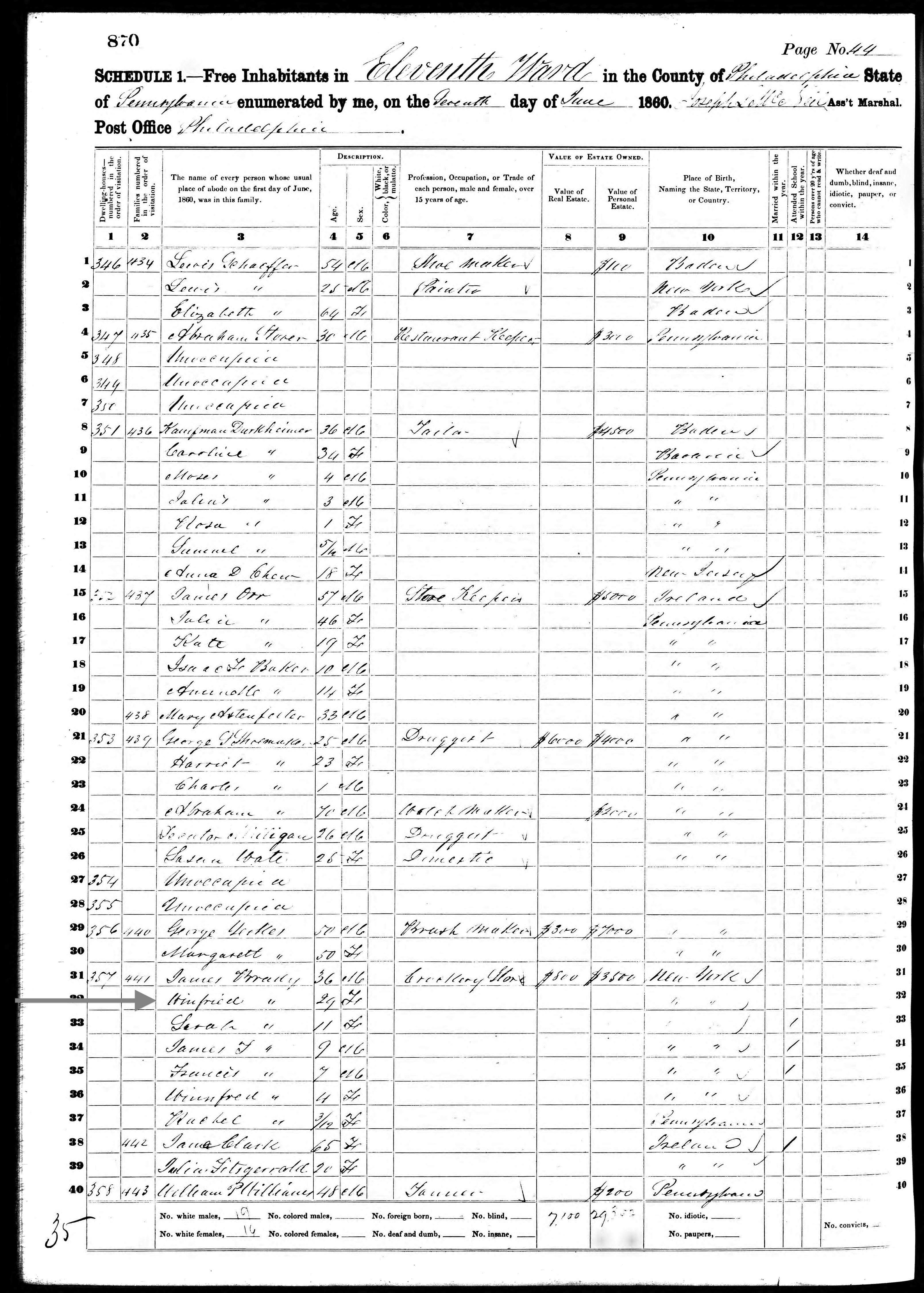 Winifred Brady; 1860 Census