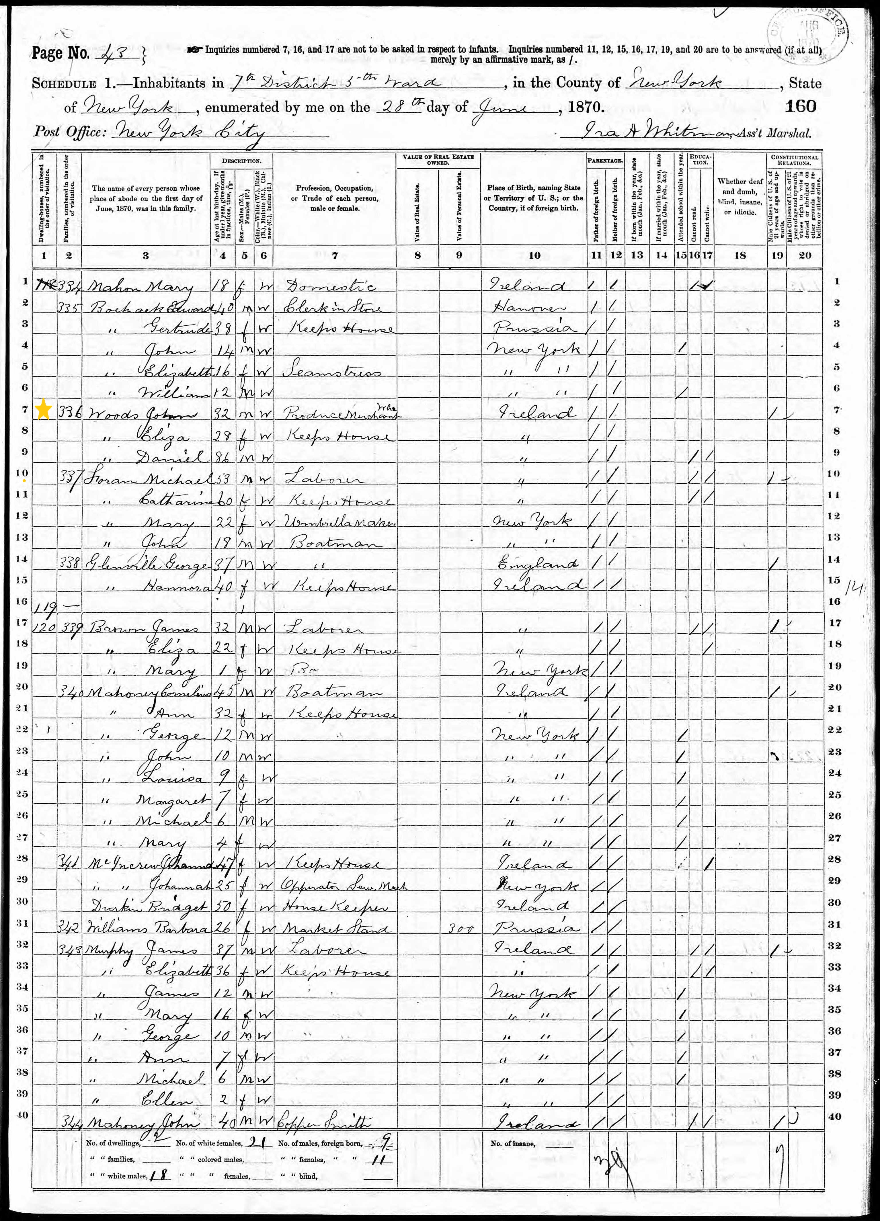 John Woods; 1870 Census