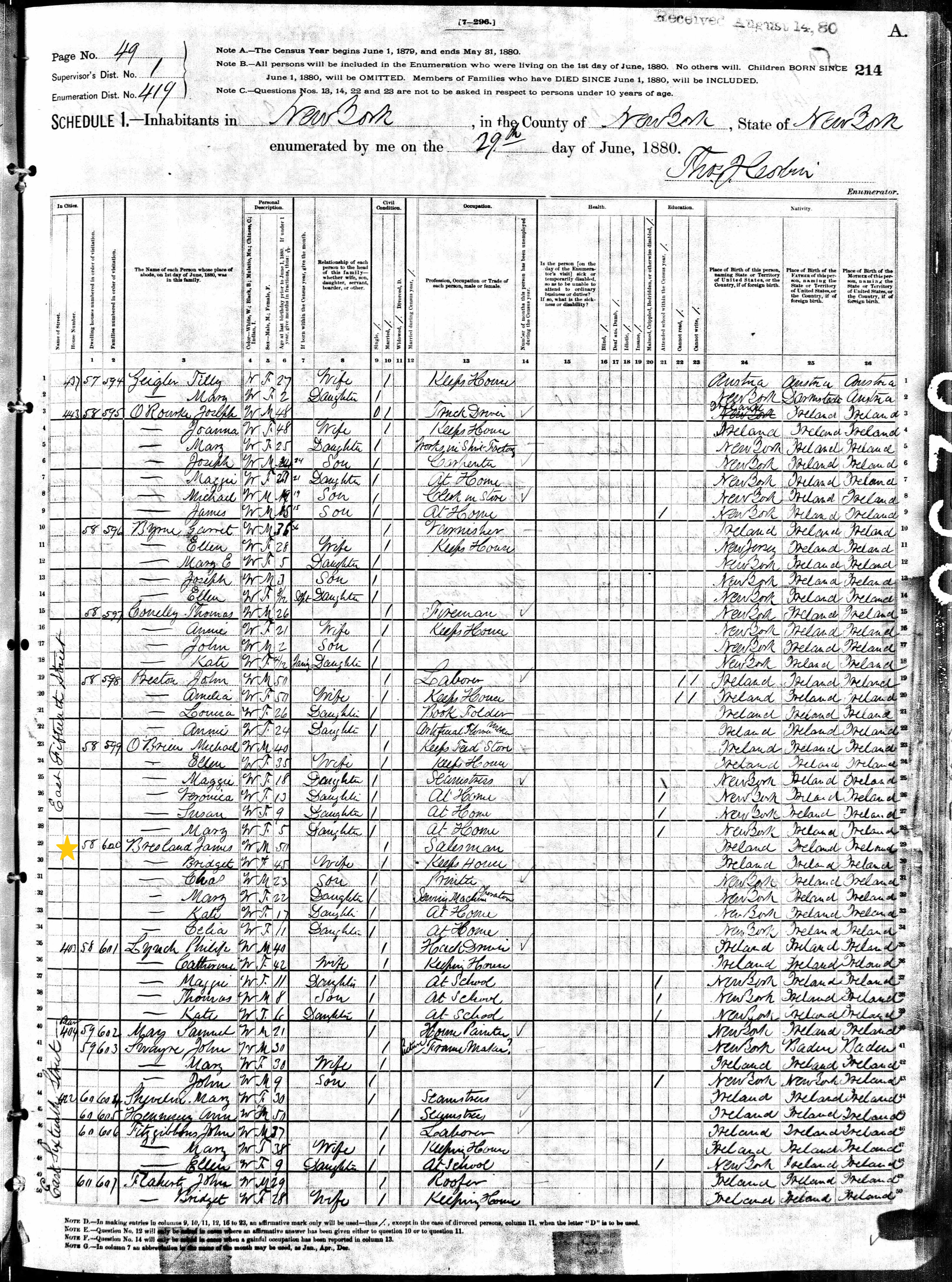 James and Bridget Bresland; 1880 Census